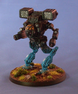 Here's an N-scale Tundra Wolf. This has been slightly modified from the original MWDA figure. I couldn't stand the bubble cockpit on the original, so I resculpted the head. I made some minor modifications to the torso to cover some of the vents, that way it didn't look like an air-conditioner on legs. I added a targeting sensor to the left arm missile launcher.